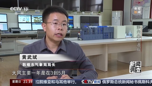 敦煌市气象局局长 黄武斌:敦煌这边其实主要是以沙漠、戈壁滩为主。整个这边是一个干旱的气候,那么大风,主要是一年是在3到5月,占全年的这个大风比例是44%。而这个西风又占大风比例的76%,所以就说如果西边的沙漠能被风吹起之后,它立马就到这个市区,就影响这个市区的能见度、沙尘天气了。