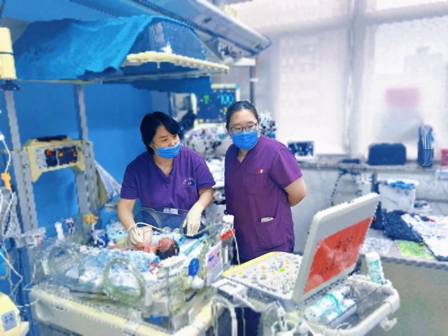 北京儿童医院新生儿重症监护病房护士长钟学红(左一)正在为重症新生儿进行护理。(北京儿童医院供图)