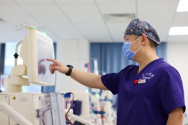 北京大学第一医院大兴院区血液透析中心护理组长隗怡正在操作设备。(北京大学第一医院供图)