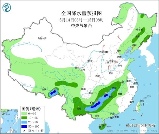 13日至16日的降雨过程影响范围较广,具有整体降雨强度不强,但单点雨势猛烈的特点。从降雨进程来看,明天为核心降雨时段,湖北东南部、湖南中部、广西西北部、贵州东南部有大雨,局地暴雨。孙倩倩介绍,此轮降雨过程范围广,由于冷暖气流都比较弱,因此降雨强度总体不强,但仍需注意防范局地可能激发的短时强降雨、雷暴大风等强对流天气。