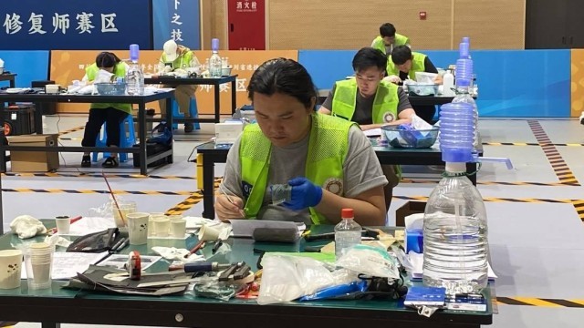 一张张工作台在宽阔的室内场地中依次排开,上面摆放着喷壶、电吹风、刷子、毛笔等各类的工具,台上之人正聚精会神地将全部注意力放在手下的纸张上,容纳着数十人的会场宁静如水,只听见喷水壶发出的细微声响……就在不久后,这里将有一张张被修复好的书画亮相,展示着“文物医生”的技能水平。