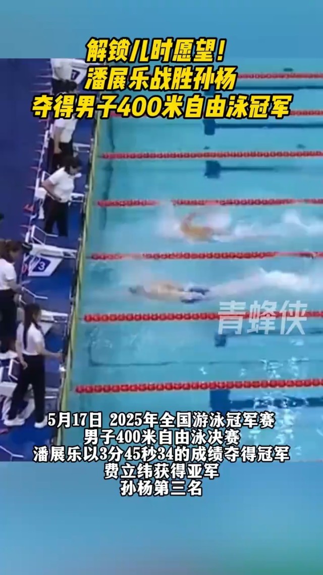 北京时间5月17日,全国游泳冠军赛男子400米决赛,潘展乐以3分45秒34的成绩获得冠军,费立纬收获亚军,孙杨则获得季军。