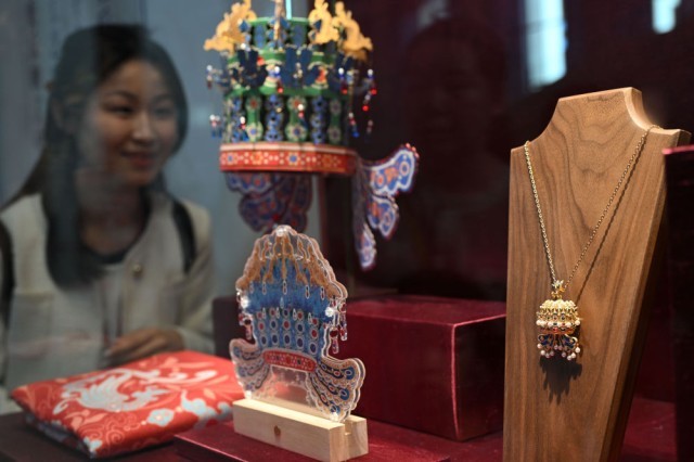 3月25日,观众在北京中国国家博物馆选购凤冠项链。新华社记者 金良快 摄