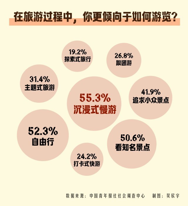 调查显示,沉浸式“慢游”(55.3%)和自由行(52.3%)更受年轻人青睐。另外,在旅程中打卡知名景点(50.6%)、追求小众景点(41.9%)也成为不少年轻人的选择。
