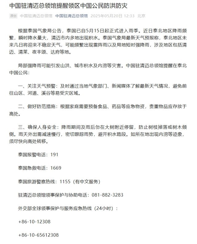 局部强降雨可能引发山洪、城市积水及内涝等灾害。中国驻清迈总领馆提醒在泰北中国公民: