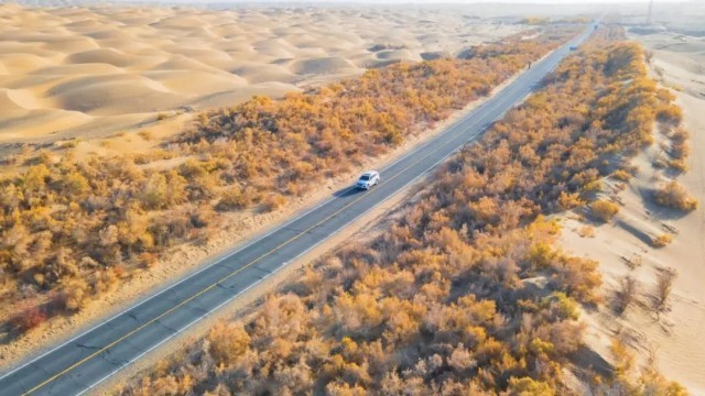 如今,从空中俯瞰,长达522公里的黑色柏油路硬生生“劈开”了中国最大流动沙漠的腹地。公路两侧,长436公里、宽约75米的防护林带随着沙丘起伏,梭梭、红柳、沙拐枣的枝干在沙漠公路两旁傲然挺立。
