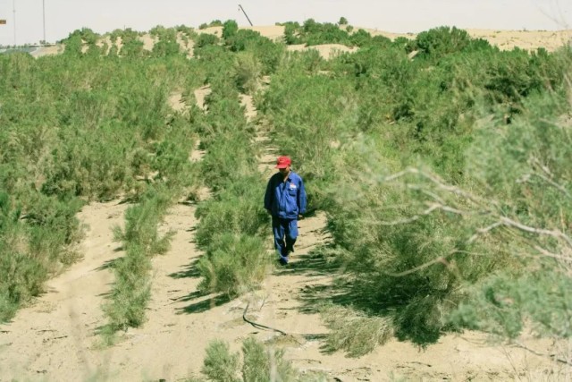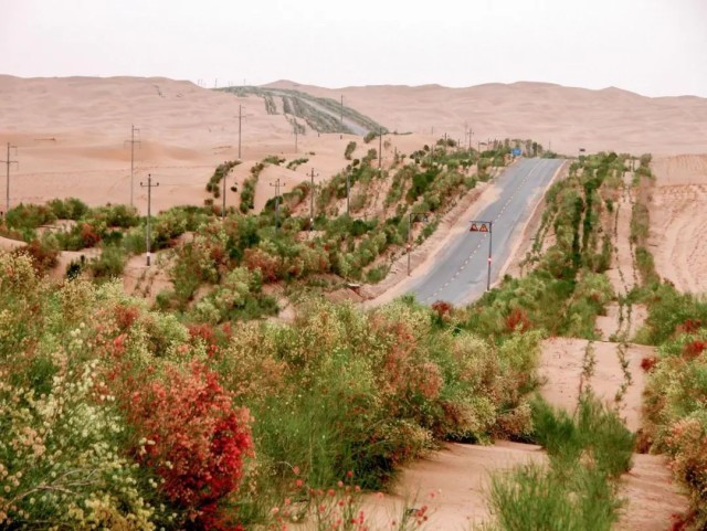“得把沙子固定住,才能守好路。”中国石油塔里木油田塔中采油气管理区生产运行部土地管理工作岗职员唐炎介绍,2006年,2000多万株梭梭、红柳等耐盐碱、耐干旱的植物开始在沙漠公路两旁“安家”。