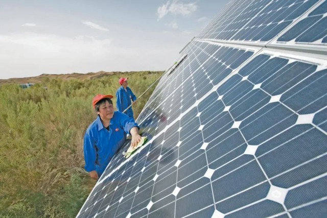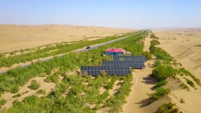 沙漠公路光伏电站建成投运后,抽水浇灌实现了“零排放”,沙漠公路两侧防护林带可实现年固碳2万吨,中和约9万台次过往车辆碳排放,塔里木沙漠公路也成为我国首条零碳沙漠公路。