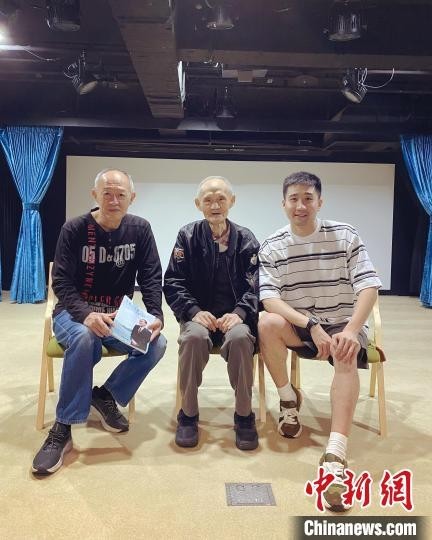 2023年5月8日,纪录片《日暮·归乡》导演杨正浓与台湾老兵金英次子金士杰(左一)、“感动中国”人物高秉涵(中)在台北交流。(片方供图)