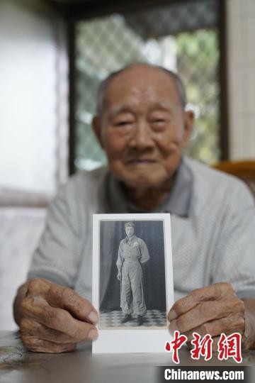 2018年5月21日,安徽合肥籍台湾老兵金英在台湾屏东家中为《日暮·归乡》剧组展示老照片。(片方供图)