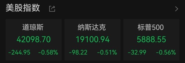 中新经纬5月29日电 美东时间周三,美股三大指数集体下跌。截至收盘,道指跌244.95点,跌幅为0.58%,报42098.70点;纳指跌98.22点,跌幅为0.51%,报19100.94点;标普500指数跌32.99点,跌幅为0.56%,报5888.55点。