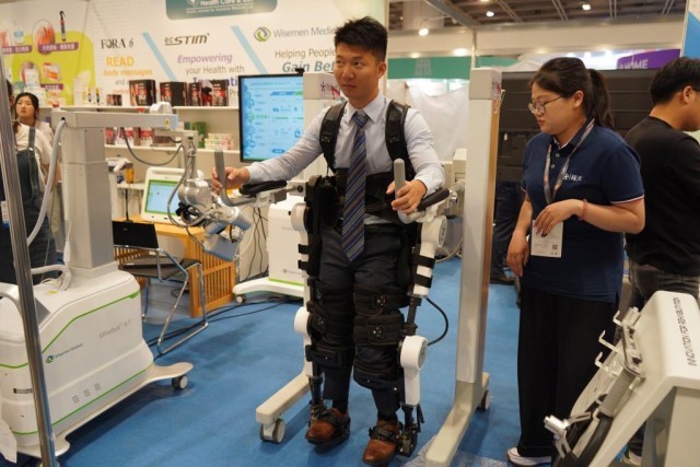 在第16届香港国际医疗及保健展上,工作人员穿戴外骨骼机器人进行操作演示(5月26日摄)。新华社发(郭辛摄)