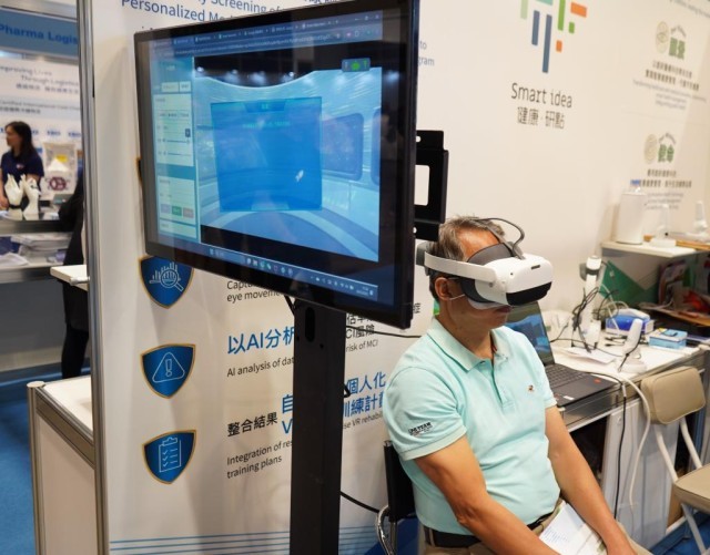 在复康及长者护理用品专区,参展商连雅娴将一个VR眼动仪戴在眼睛上。“这个只有墨镜盒大小的仪器具备眼动追踪技术,能在5分钟内对长者进行认知障碍症评估,并制订个人化康复训练计划。”