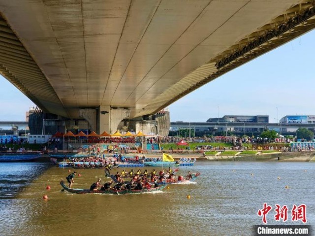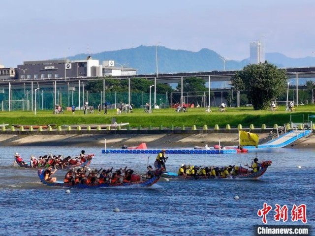 5月30日,台湾迎来端午节连假,全台多地举行龙舟比赛等活动。图为台北大佳河滨公园,2025台北国际龙舟锦标赛首日比赛正在进行。中新社记者 张晓曦 摄