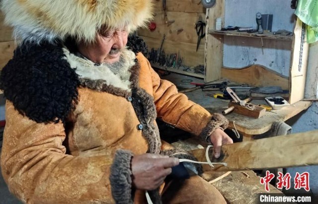 中新网乌鲁木齐5月31日电 (胡嘉琛)在新疆阿勒泰市拉斯特乡,年过七旬的斯兰别克·沙合什与儿子胡安什别克隔几日便会来到工作坊,轻车熟路地在桦木板上打孔穿绳,制作毛皮滑雪板。