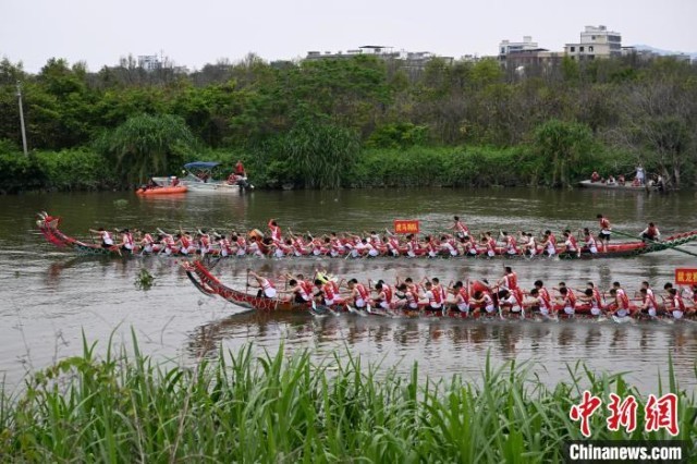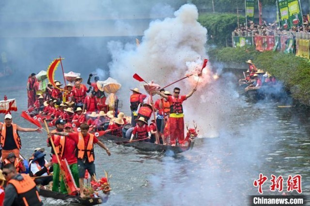 5月31日,广东省揭阳市潭王村举办赛龙舟活动。潭王村是远近闻名的“龙舟之乡”,端午赛龙舟成为该村连结乡情、敦睦乡谊的重要传统活动。 中新社记者 陈楚红 摄