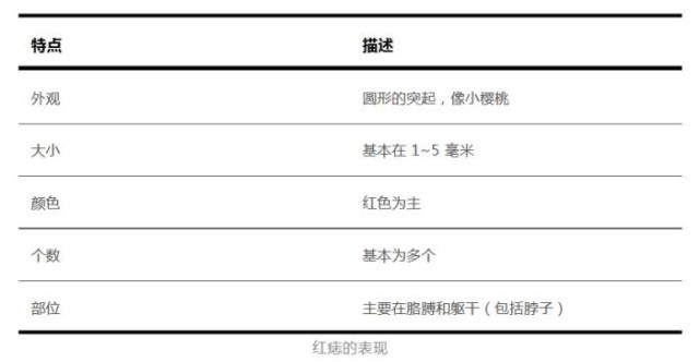 红痣其实比较好判断,基本的特点就是圆形的小颗粒,大多在 1 毫米到 5 毫米之间。由于是血管的增生,它一般是红色的,偶尔会有紫色的,个别时候带点蓝色。正因如此,它还有另一个名字,叫作“樱桃状血管瘤”。