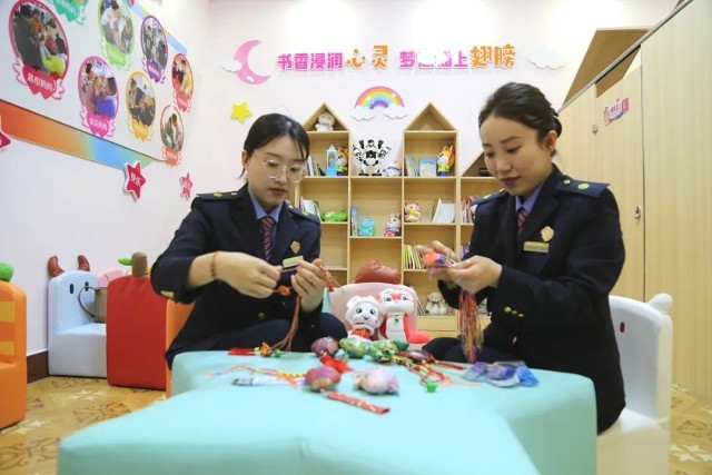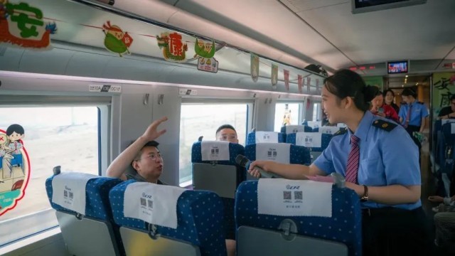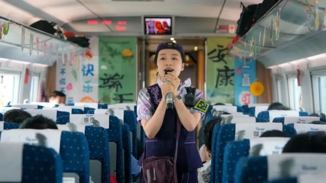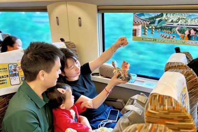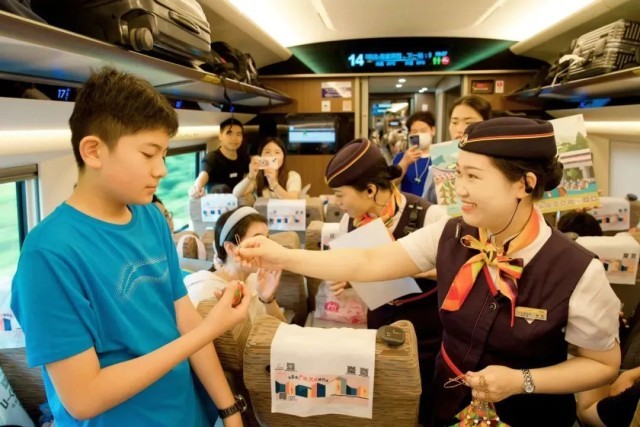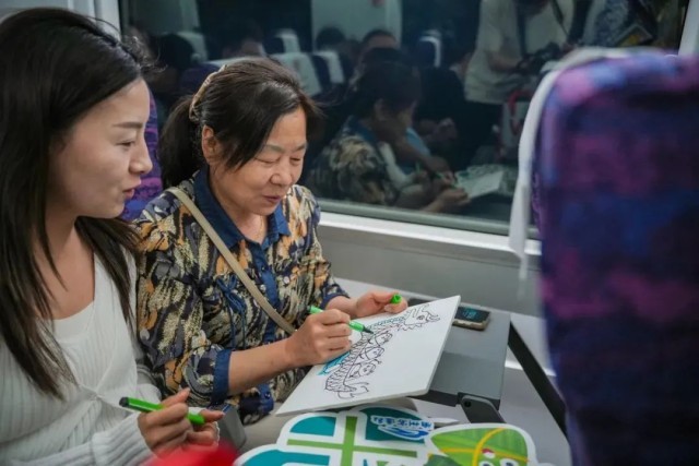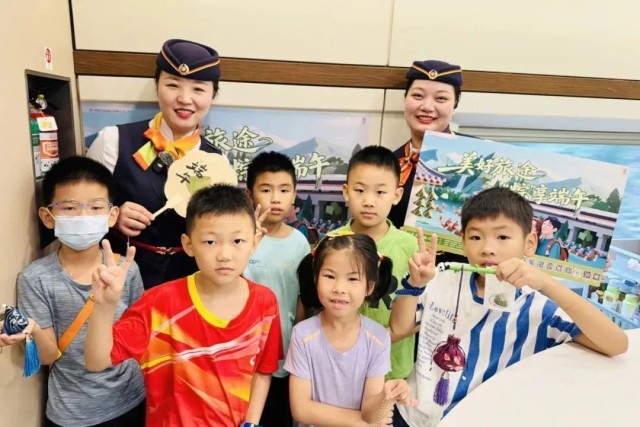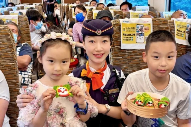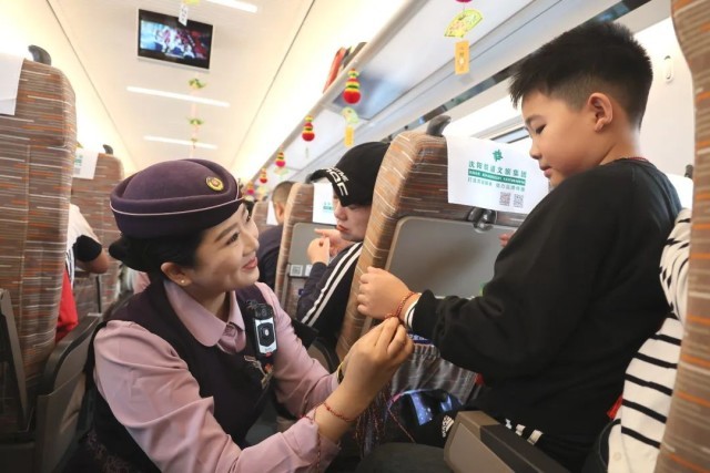 在开往北京的Z502次列车上,乘务员教旅客编织五彩绳;驶向贵阳的G3732次列车上,歌声伴着手工课悠扬回荡;途经潮汕的G6353次列车上,乘务组用工夫茶具演绎“曲水流觞”的雅趣……