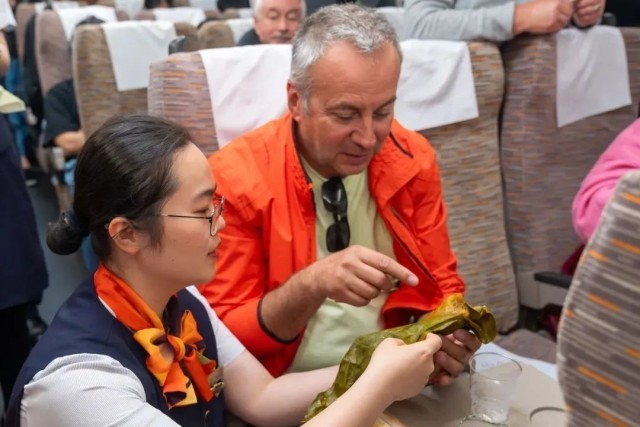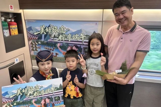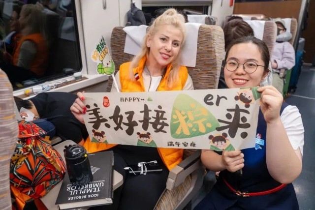 在长沙客运段值乘的香港西九龙开往昆明南的列车上,中外旅客齐聚一堂,举着粽子和节日手举牌自拍打卡,车厢内洋溢着节日的喜庆气氛。一位来自德国的男士用刚学会的中文向身边的旅客挥手问好:“端午安康!”