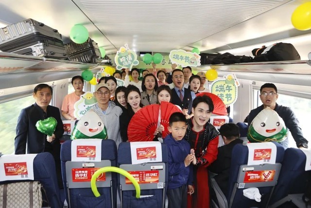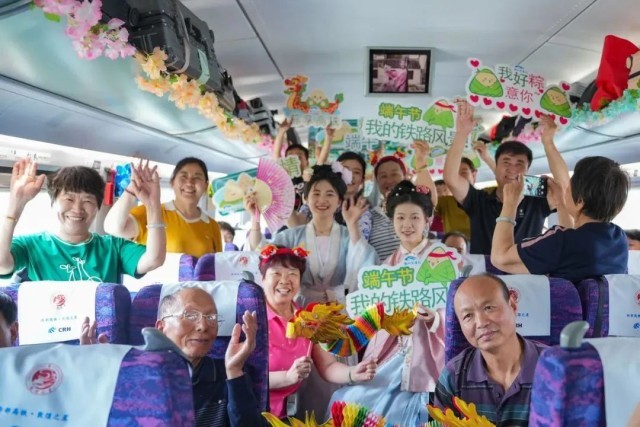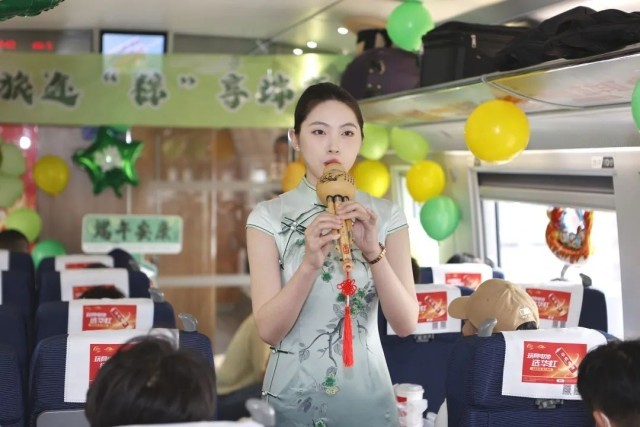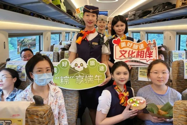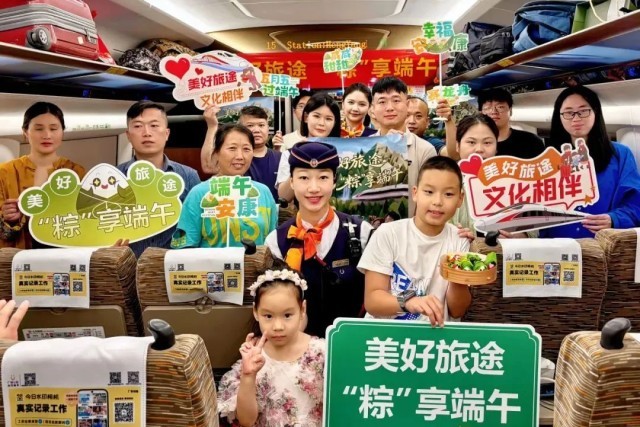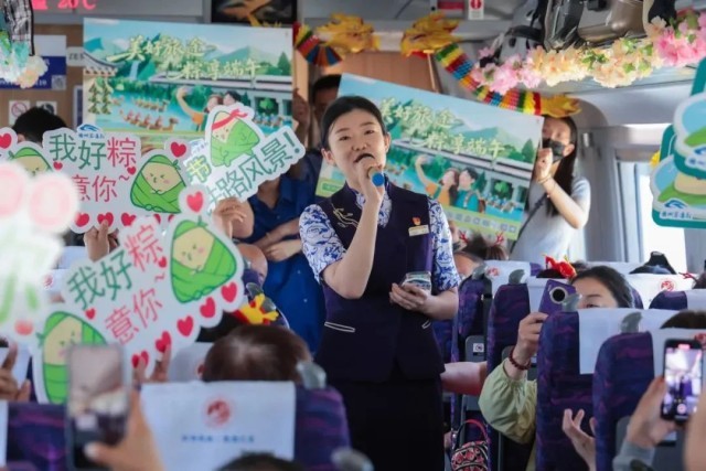 兰州客运段在G2096次列车上为旅客带来甜美的歌曲和精美的节日纪念品,并与旅客开展趣味问答、历史讲解、“端午”主题游戏、文化体验等多种形式的互动,让高铁旅程成为感知中华优秀传统文化的流动课堂。
