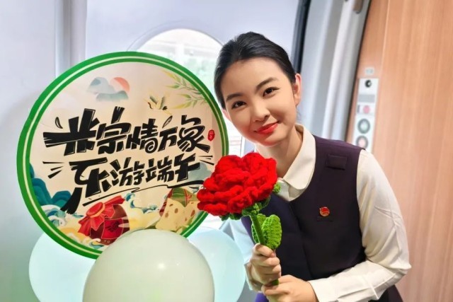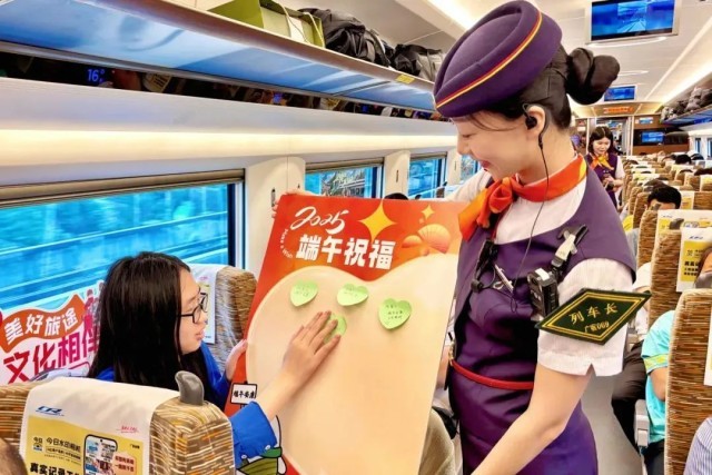 车厢内粽香四溢,窗花与香囊点缀其间,旅客在互动中体验传统习俗的温情,沉浸式感受节日氛围。旅客王女士说:“没想到在高铁列车上还能过端午节,又能看表演、还能做游戏,体验制作五彩绳和香包,真的是一次不一样的旅途。”