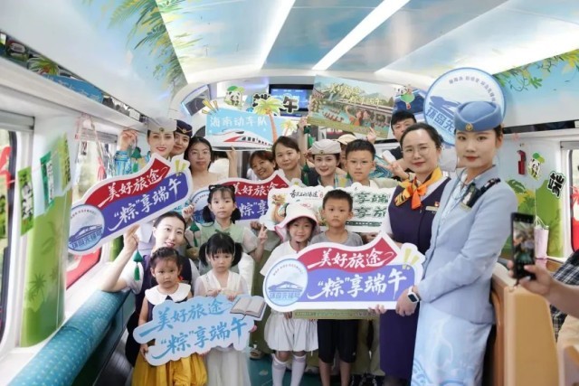 在环岛高铁C7310次、C7841次及三乐线S6704次列车上,海口车务段海南动车队工作人员为旅客送上艾叶香包和铁路文创冰箱贴,传递健康平安的祝福。全国劳动模范梁希影领唱《我和我的祖国》,列车乘警科普铁路安全知识,餐车工作人员带来精彩舞蹈,现场气氛热烈。