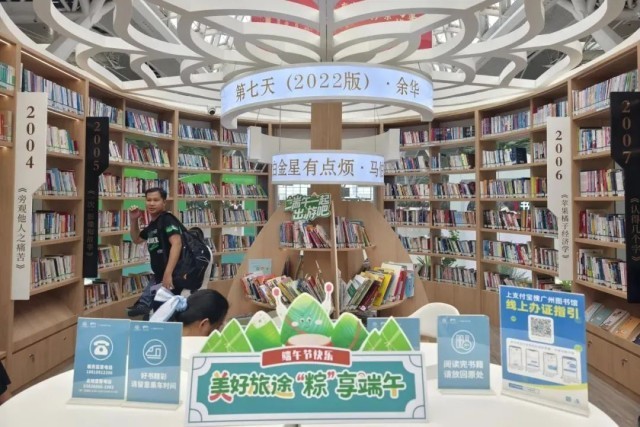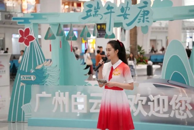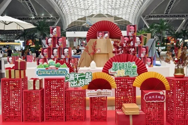 广州南站在车站三层、一层候车室服务台位置布置了粽子、龙舟等形状的香包装饰并制作了活动海报,营造浓厚的节日氛围。旅客阅读空间增设了与端午节相关的儿童图书,“初心·春澜”音乐厅邀请旅客弹奏音乐,为假期出行增添“诗与远方”的美好体验。