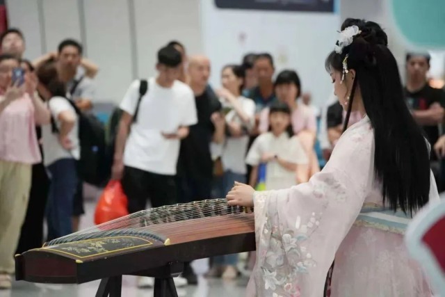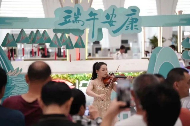一曲小提琴独奏《云宫迅音》拉开广州白云站快闪活动的序幕,悠扬的旋律如清风拂过站台,为旅途注入诗意。随后,小提琴与古筝创新合奏《青花瓷》惊艳亮相,古筝独奏《不谓侠》则以江湖快意演绎端午的别样风情。