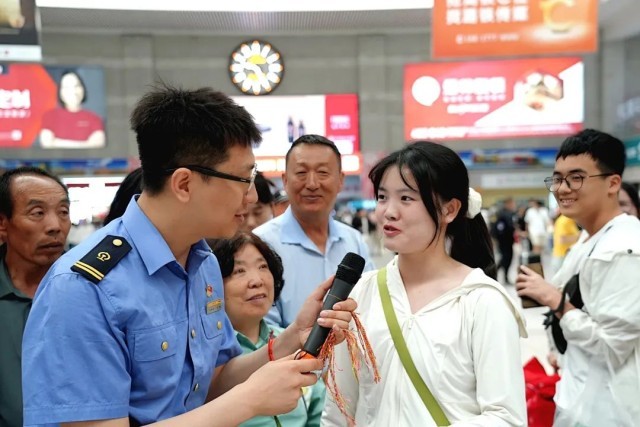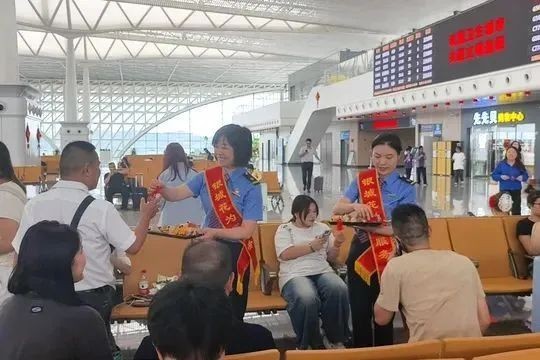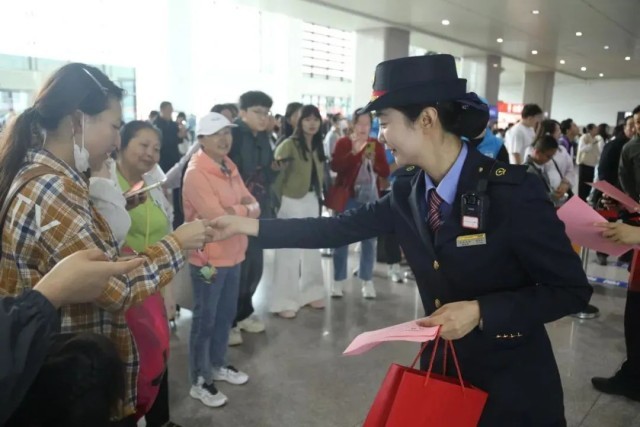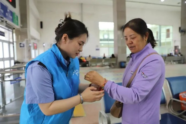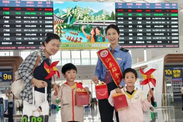 在汕头站,“金凤”服务岗的工作人员化身文化使者,为旅客讲解端午习俗,将一个个饱含节日祝福的端午香囊递到旅客手中,不仅展现了温馨细致的服务,更让旅客在旅途中感受到传统文化的独特魅力。