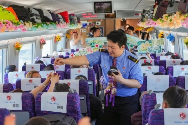 在广九客运段担当的北京西、兰州西、香港西九龙、成都西、梅州西、蚌埠南、桂林北、大理、苏州南等方向的10余趟列车上,乘务人员精心策划,让列车“盛装”迎接端午节。