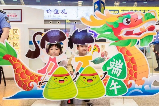 沈阳站在候车大厅、进站通道、售票大厅等醒目位置放置活动宣传海报,特别设置的端午主题打卡专区和极具创意的造型打卡板,吸引旅客们纷纷驻足拍照。