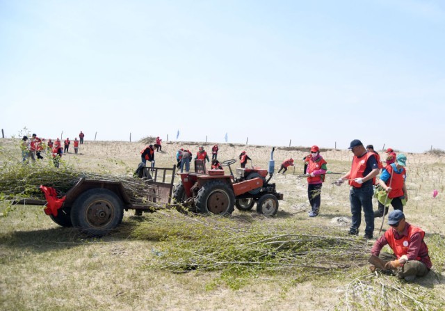人们在地处浑善达克沙地的正蓝旗宝绍岱苏木开展植绿活动。新华社 发