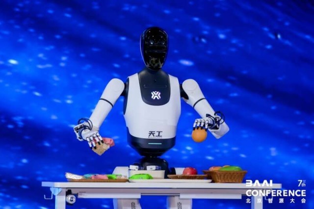 6月6日,第七届“北京智源大会”上,天工2.0完成“水果摆盘”的精细化服务任务。主办方供图