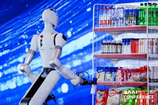 6月6日,第七届“北京智源大会”上,银河通用机器人GALBOT站在货架前。主办方供图