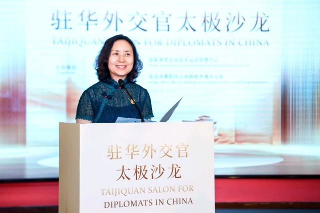 6月6日,北京,“驻华外交官太极沙龙”活动上,国家体育总局武术运动管理中心主任、国际武联秘书长张玉萍女士致辞。主办方供图