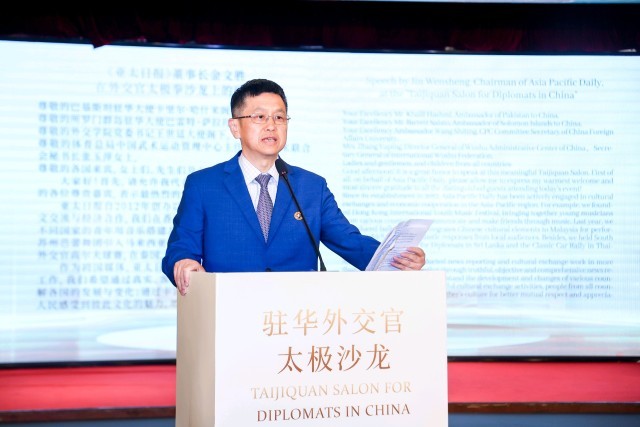 6月6日,北京,“驻华外交官太极沙龙”活动上,《亚太日报》董事长金文胜致辞。主办方供图