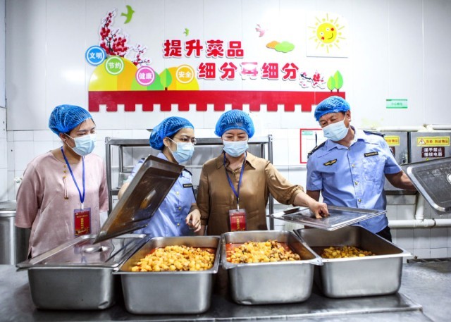 6月5日,在河南省焦作市博爱县第一中学,县纪委监委工作人员联合市场监管部门对考点食堂开展食品安全专项监督检查。新华社发(程全 摄)