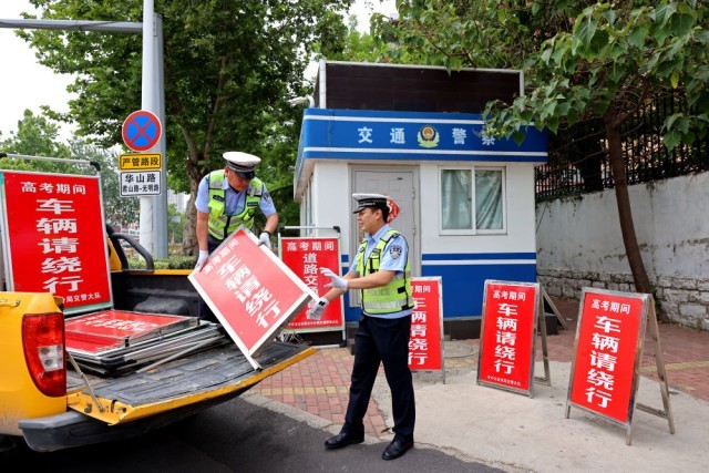6月6日,山东省枣庄市公安局市中分局交警大队辅警把高考期间道路交通管制标志牌运送到各考点执勤岗。新华社发(孙中喆 摄)
