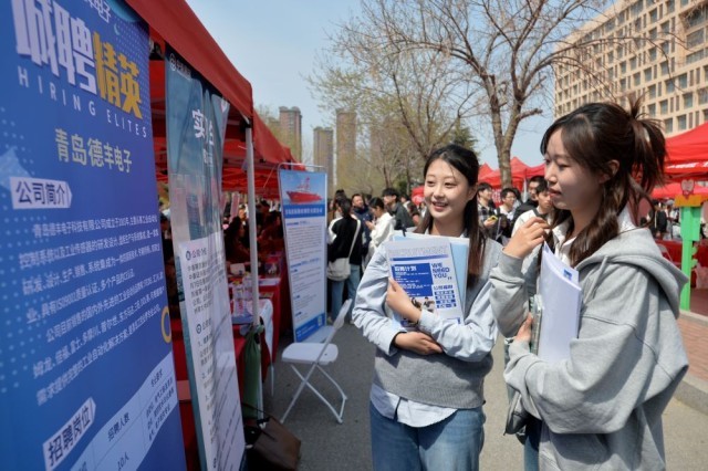 4月11日,学生在山东青岛科技大学2025年春季综合类大型双选会招聘活动现场查看企业资料。