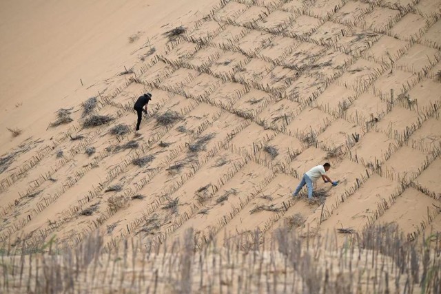 鄂尔多斯市达拉特旗农民在防沙治沙项目区铺设沙障。新华社发(杨耀中 摄)