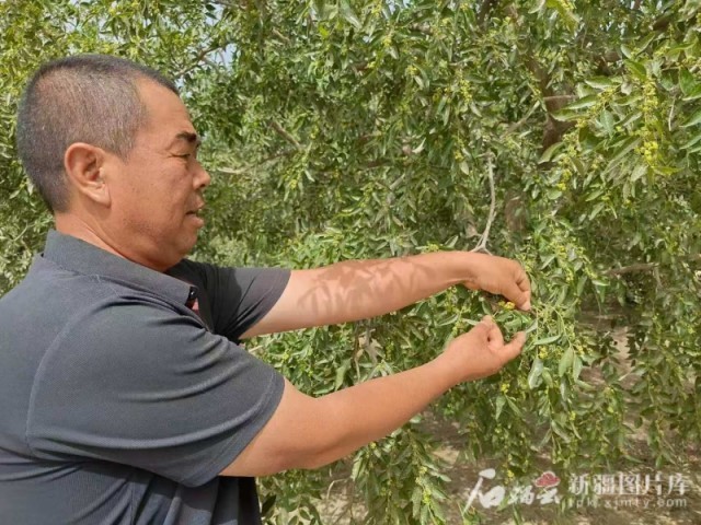 红枣种植户赵连斌察看枣树生长情况。石榴云/新疆日报记者 张磊摄