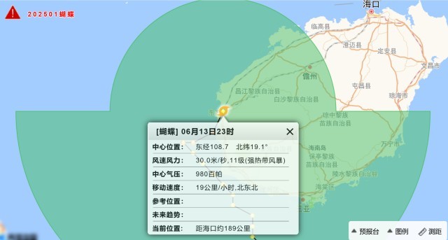 记者从海南省气象部门了解到,今年第1号台风“蝴蝶”(强热带风暴级)的中心已于6月13日23时前后在海南省东方市八所镇登陆,登陆时中心附近最大风力有11级(30米/秒),中心附近最低气压980百帕。