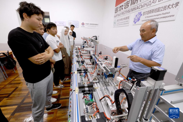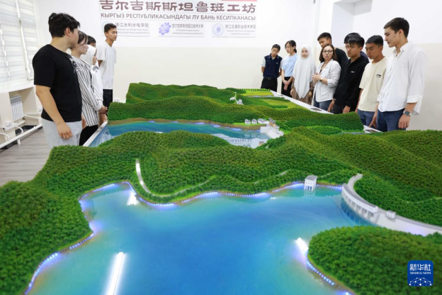 6月4日,在吉尔吉斯斯坦首都比什凯克,师生在吉尔吉斯斯坦鲁班工坊水利枢纽工程模拟演示实验室学习水电站知识。新华社发(罗曼摄)
