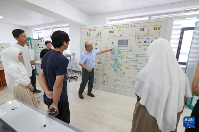 6月4日,在吉尔吉斯斯坦首都比什凯克,吉尔吉斯斯坦鲁班工坊负责人阿克尔别克·奇梅罗夫(后中)在鲁班工坊电力系统综合自动化实验室向学生讲解仿真油气水系统。新华社发(罗曼摄)
