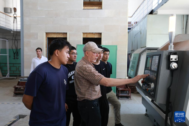 6月4日,在吉尔吉斯斯坦首都比什凯克,师生在吉尔吉斯斯坦鲁班工坊水利工程材料检测实验室操作数控车床。新华社发(罗曼摄)