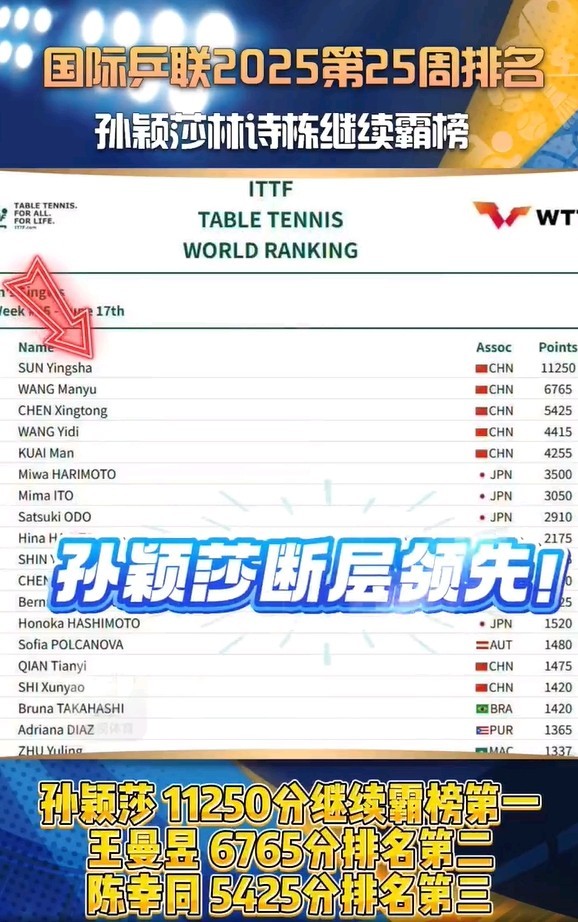 据央视体育,国际乒联公布2025年第25周排名,孙颖莎11250分继续霸榜第一,断层领先。王曼昱排名第二,陈幸同位列第三。男单方面,林诗栋8675分位居第一,王楚钦排名第二。