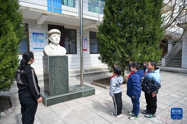 清明节前,河北省平山县雷烨希望小学师生共同缅怀雷烨烈士(2025年3月31日摄)。新华社记者 刘金海 摄
