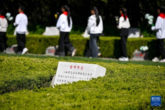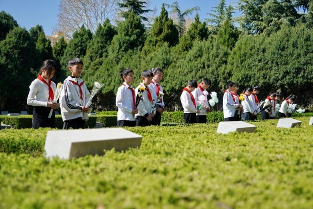 2025年4月1日,石家庄市宁安路小学学生在华北军区烈士陵园瞻仰雷烨等烈士的墓碑。新华社记者 刘金海 摄