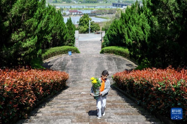 2025年4月2日,在浙江省金华市孝顺革命烈士陵园,雷烨的外甥女项碧英前往祭扫雷烨。在孝顺革命烈士陵园,当地政府用雷烨的原名项俊文竖立墓碑。“项俊文”这三个字,永远镌刻在了“孝顺镇革命烈士英名录”的石碑之上。新华社记者 刘金海 摄