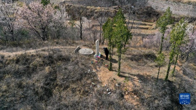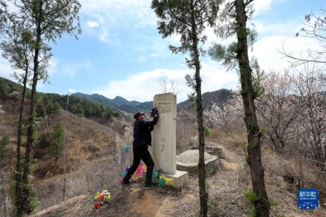 清明节前,河北省平山县南段峪村村民、雷烨希望小学退休教师王海军祭扫“雷烨烈士纪念碑”(2025年3月31日摄)。新华社记者 刘金海 摄